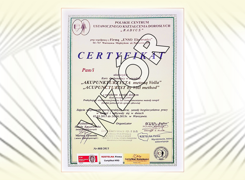 Uprzejmie informujemy, że aby otrzymać certyfikat ze specjalizacją "Akupunkturzysta metodą Volla" należy ukończyć u Nas 3 stopnie kursów popartych wydanymi certyfikatami tj.